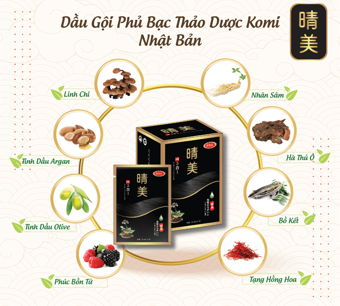 Dầu gội nhuộm hữu cơ KOMI đen tự nhiên dạng gói giúp phủ tóc bạc nhẹ nhàng, làm sạch da đầu, màu tóc đều đẹp, dễ dùng và an toàn.