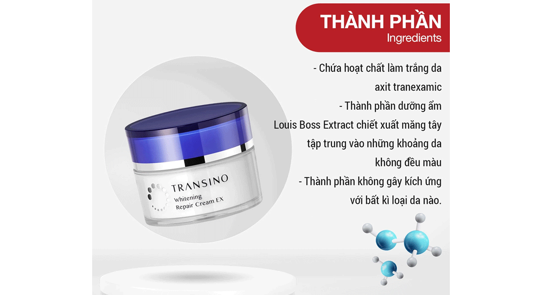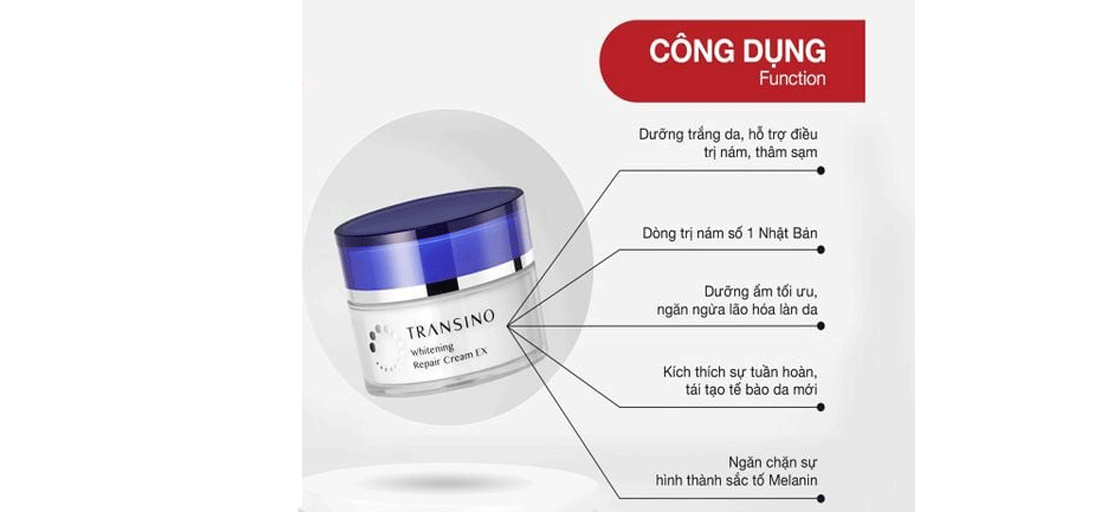 Kem phục hồi dưỡng trắng da mờ thâm nám Transino Whitening Repair Ex 35g là giải pháp chăm sóc da chuyên sâu giúp cải thiện sắc tố, giảm thâm sạm và tái tạo làn da khỏe mạnh. Đây là sản phẩm được ưa chuộng nhờ công thức chuyên biệt dành cho da bị nám, tàn nhang và tổn thương sắc tố. Các từ khóa phụ gồm kem trị nám Transino, dưỡng trắng da Nhật Bản, Transino Whitening, giảm thâm nám hiệu quả giúp tăng hiệu quả SEO.